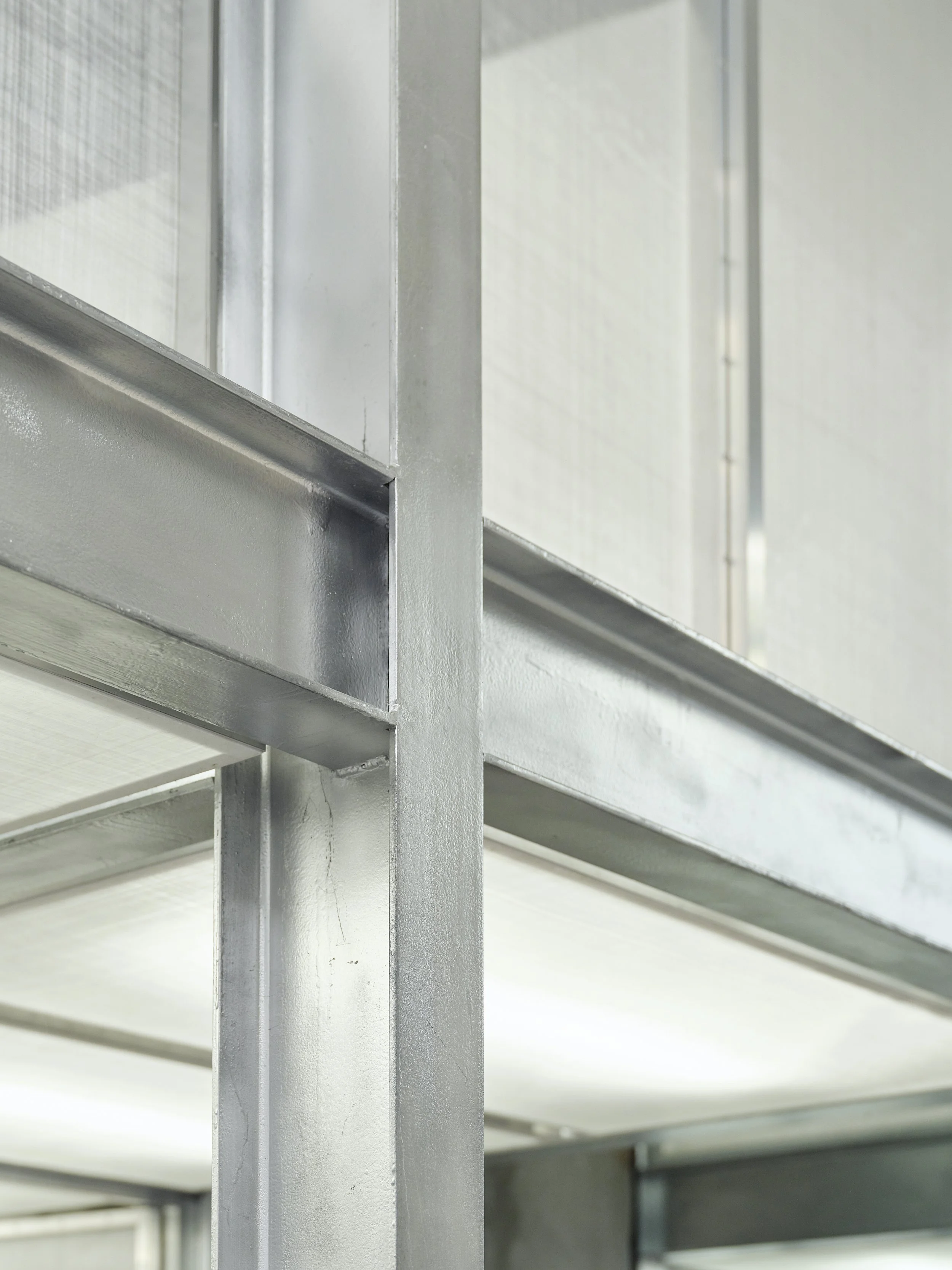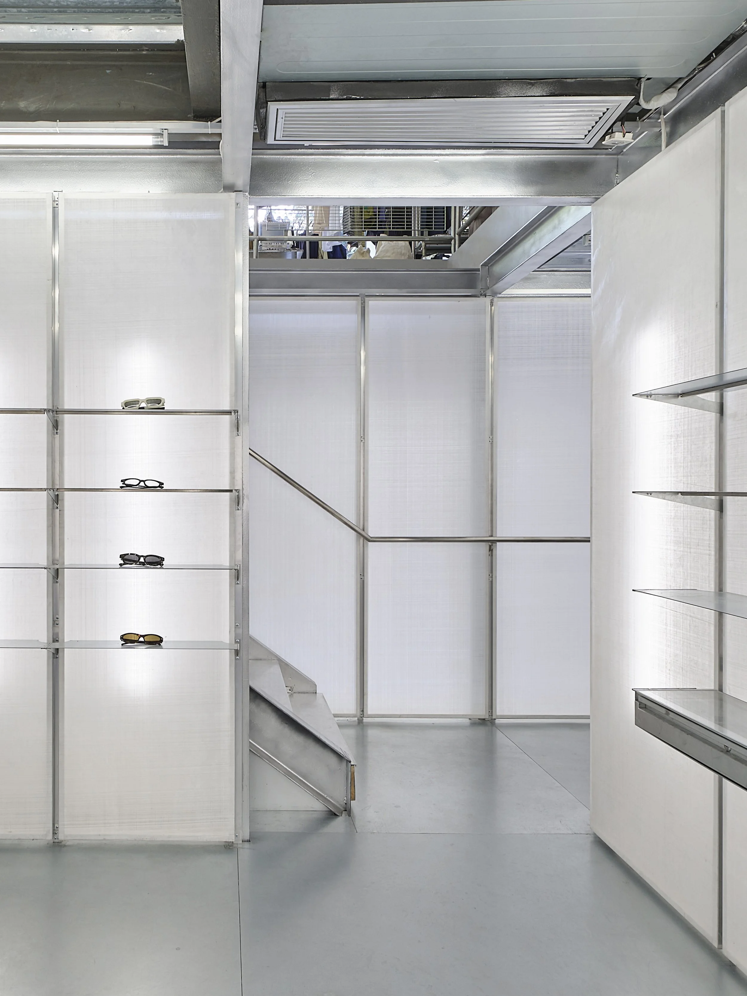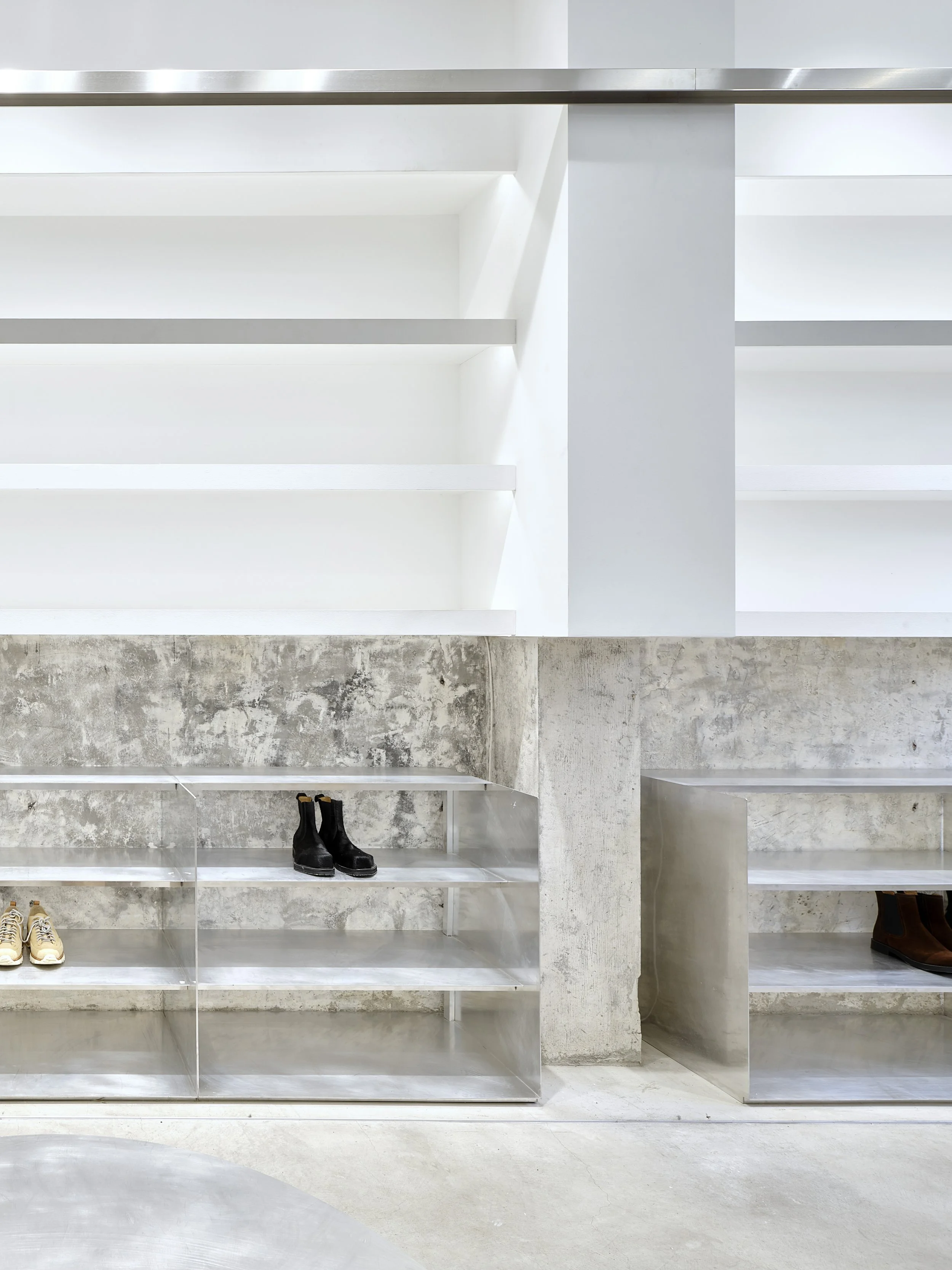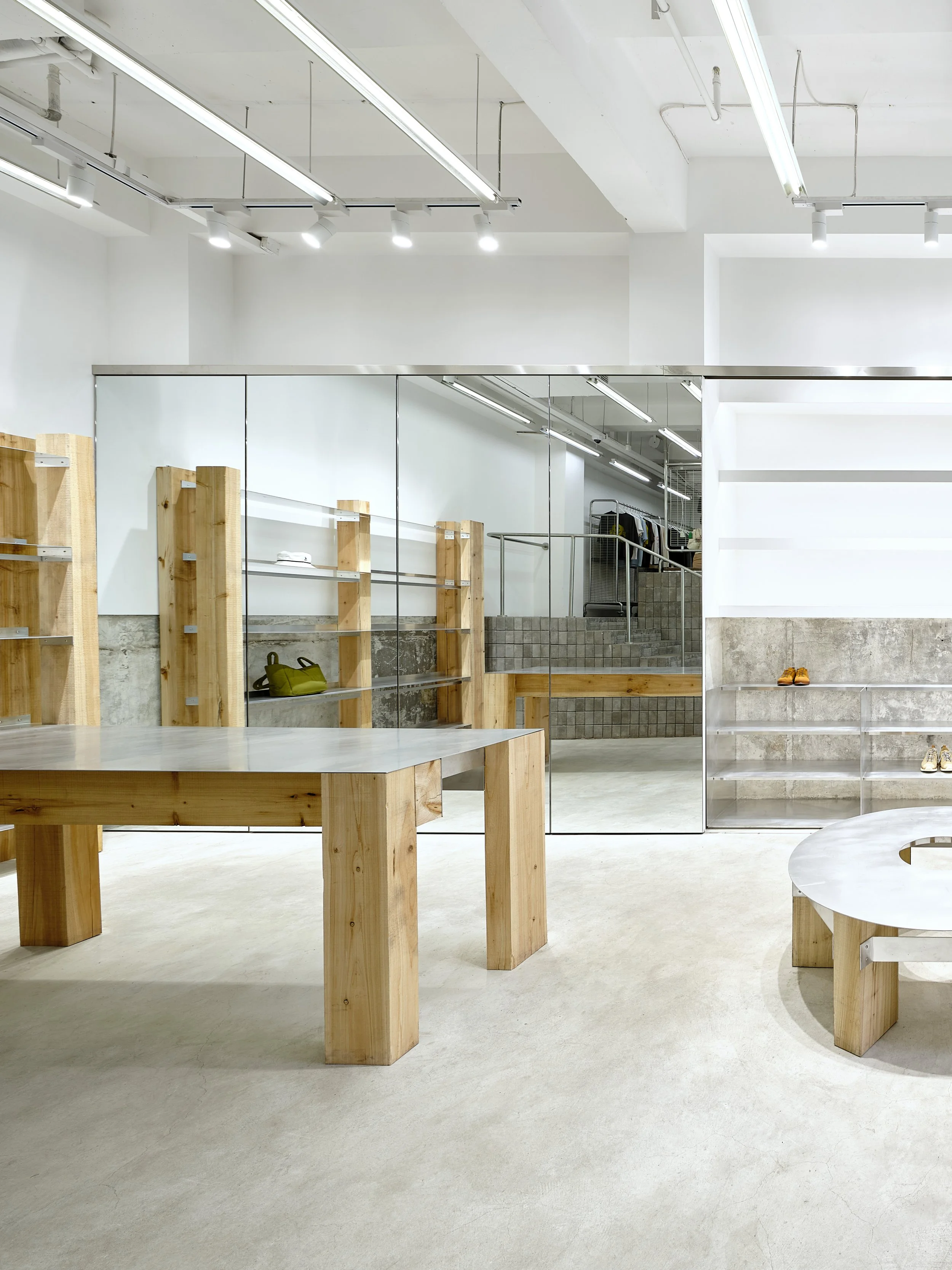 The updated store for In the Park Mall, Shanghai required a remodelling of the post-industrial site’s interior. All fittings and finishes were stripped back to the building’s structural shell and a series of objects were installed to support the store’s function. These objects, crafted from raw aluminium and 200 x 100mm timber, range in scale from a large 5 x 4 metre light box to a series of tables and a stool and serve as the only devices to organise the space. These props are ambiguous, and are each an inquiry into the notion of completeness. How do we perceive something as complete? We wait for architecture to be sealed, the gaps covered up.